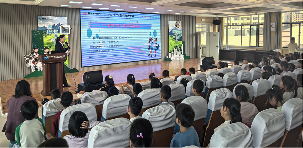 东胜支行党支部党员化身“金融导师”,以童趣化方式解构专业知识,将“认识银行”设计成闯关游戏,让学生们在趣味挑战中了解金融机构职能;把“储蓄理财”转化为互动情景剧,让学生们从“想要与需要”中培养财商思维。聚焦校园反诈热点,通过“陌生电话要密码”“免费礼物套信息”等场景化演绎,拆解诈骗套路,提炼“不透露、不相信、不行动”的防骗口诀,让学生在欢笑中掌握“存钱有规划、花钱有节制、防骗有办法”的金融生存技能。“金融知识小问答”环节中,学生们踊跃抢答、声音洪亮,现场掌声此起彼伏。同时给现场回答问题的学生们颁发“最佳小小银行家”奖状及定制礼品,以此鼓励他们对金融知识的积极探索。该校教师表示,这种采取趣味宣讲与荣誉激励相结合的活动形式,大大激发了学习热情,让学生们在快乐互动中了解基础金融知识,将防骗意识深植于心