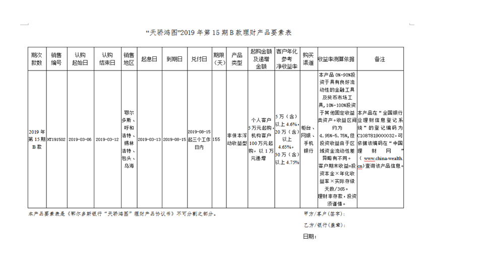 本行推出“天骄鸿图”2019年第15期B款非保本浮动收益型理财产品,预期年化收益率5万(含)以上4.6%,20万(含)以上4.65%,50万(含)以上4.75%,投资期限155天,起购金额5万元。以20万本金为例,预计可获收益3949.32元。该期产品于2019年3月6日开始募集,2019年3月13日起息,欢迎到鄂尔多斯银行各营业网点咨询购买!