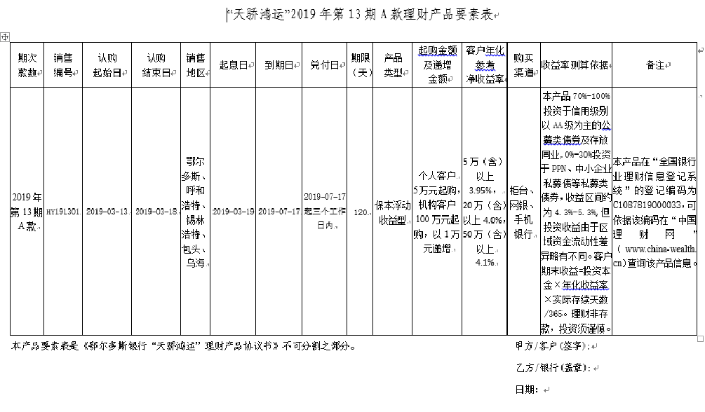 天骄鸿运2019年第13期A款理财产品募集公告(2019年3月13日更新)